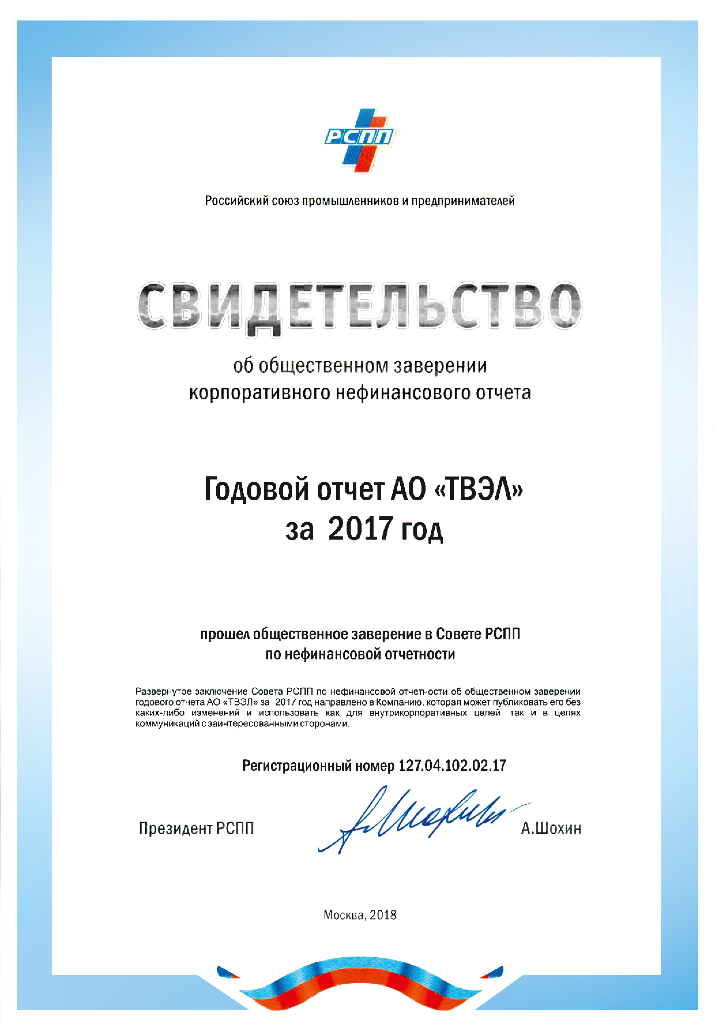 Годовой отчет АО «ТВЭЛ» за 2017 год прошел общественное заверение в Совете РСПП по нефинансовой отчетности