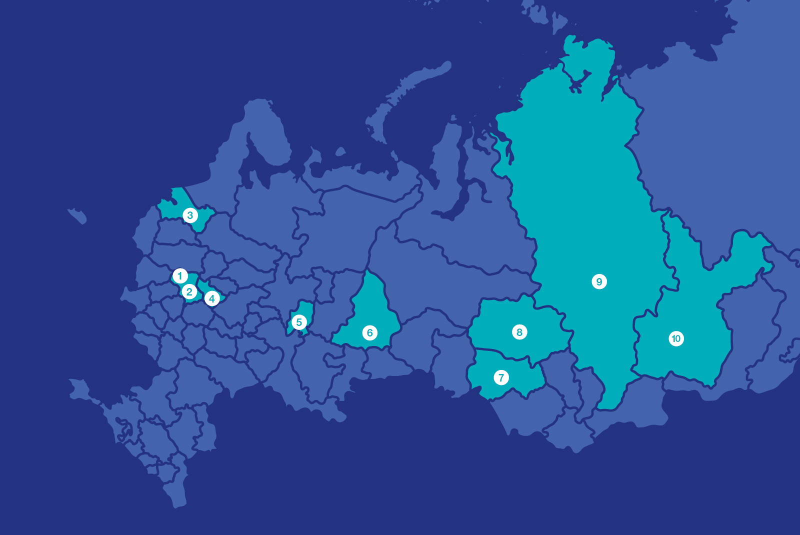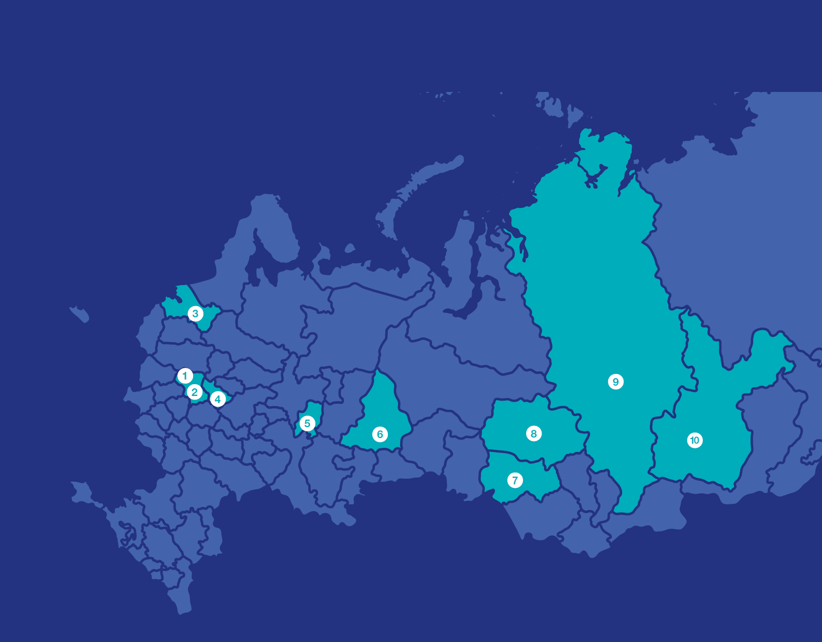 Предприятия Топливной компании ТВЭЛ находятся в 10 регионах Российской Федерации. Расположение активов Компании в различных регионах России обеспечивает эффективную кооперацию и сотрудничество с партнерами по широкому спектру вопросов и направлений.