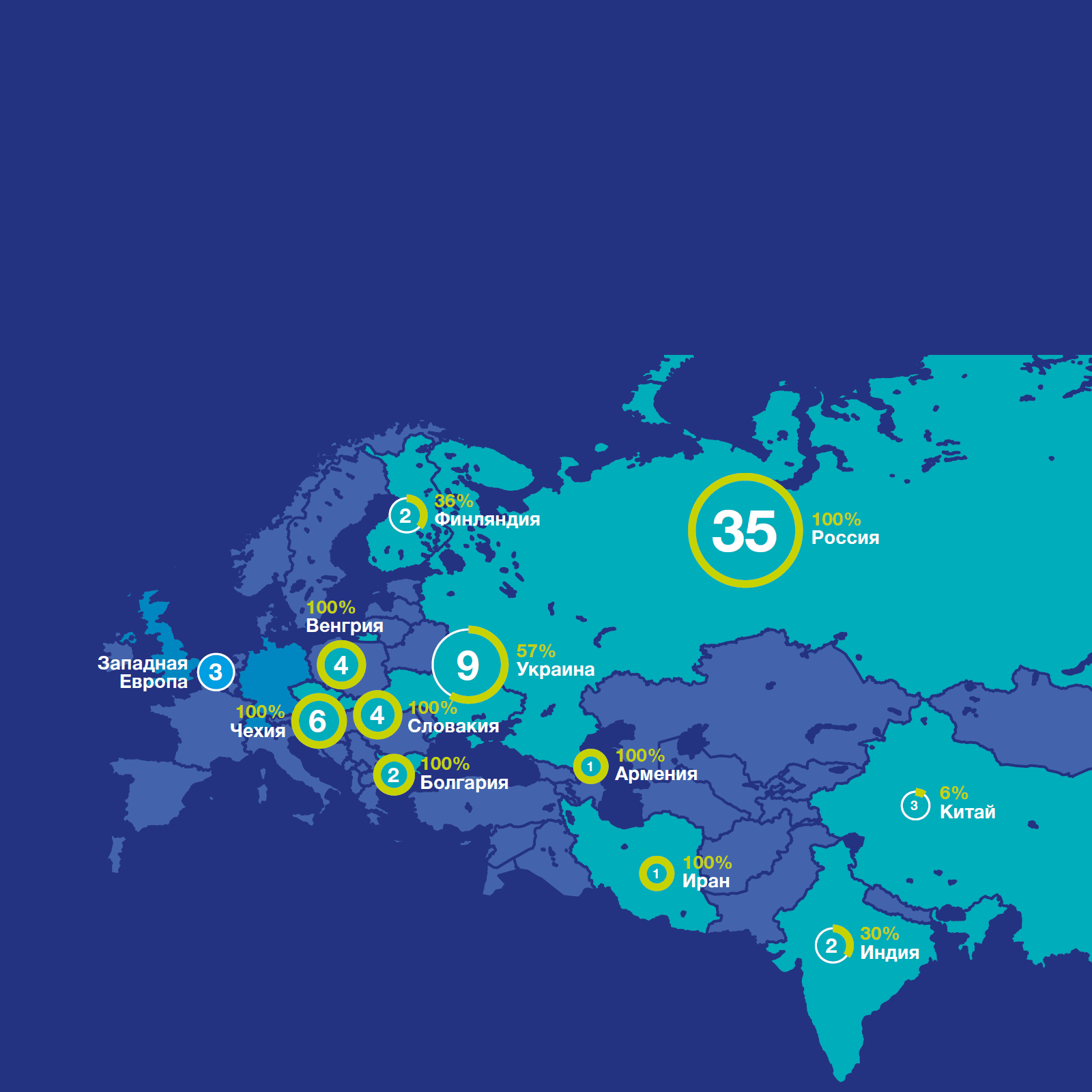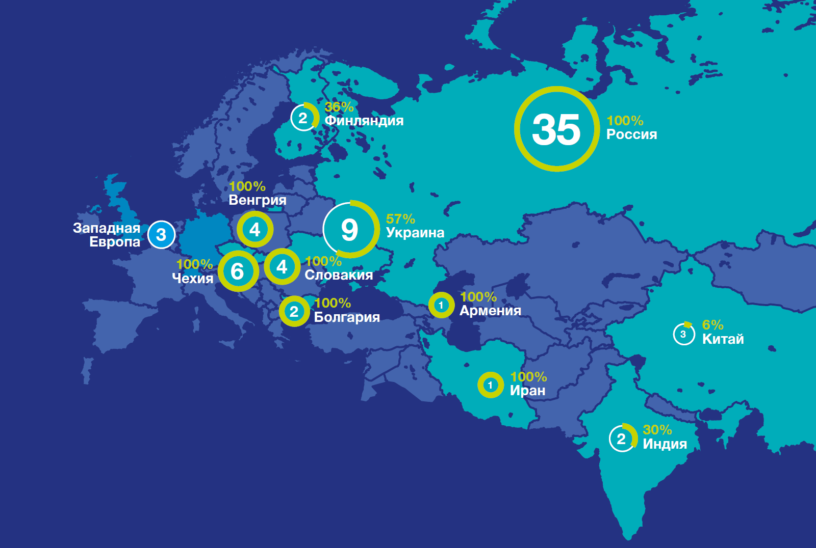 Наибольшее количество энергоблоков, находящихся в эксплуатации, расположено в Азиатско-Тихоокеанском регионе, Северной Америке и Западной Европе. В 15 странах мира в данный момент сооружается еще 57 энергоблоков, в том числе 7 - в России.