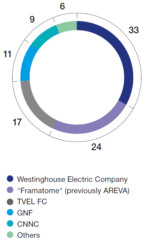TVEL Fuel Company is one of the global leaders in nuclear fuel production. The Company's share in the global market of fuel fabrication in 2017 reached ~17%*. TVEL Fuel Company jointly with TENEX JSC provides a significant part of the needs of foreign design reactors in uranium enrichment services.
