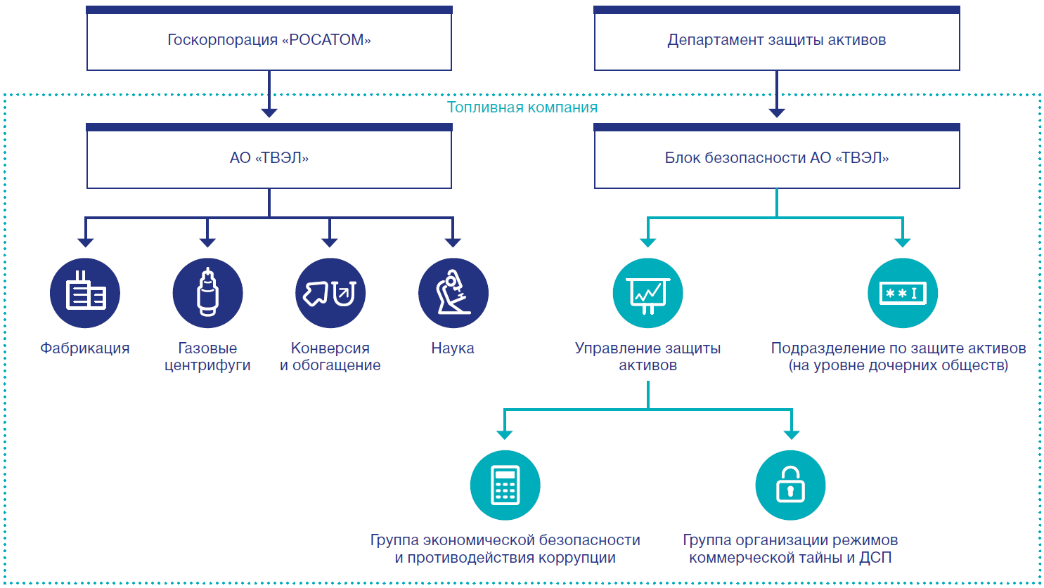 - блок по безопасности (на уровне АО «ТВЭЛ»), включающий Управление защиты активов, состоящее из группы экономической безопасности и противодействия коррупции и группы организации режмов коммерческой тайны и ДСП;