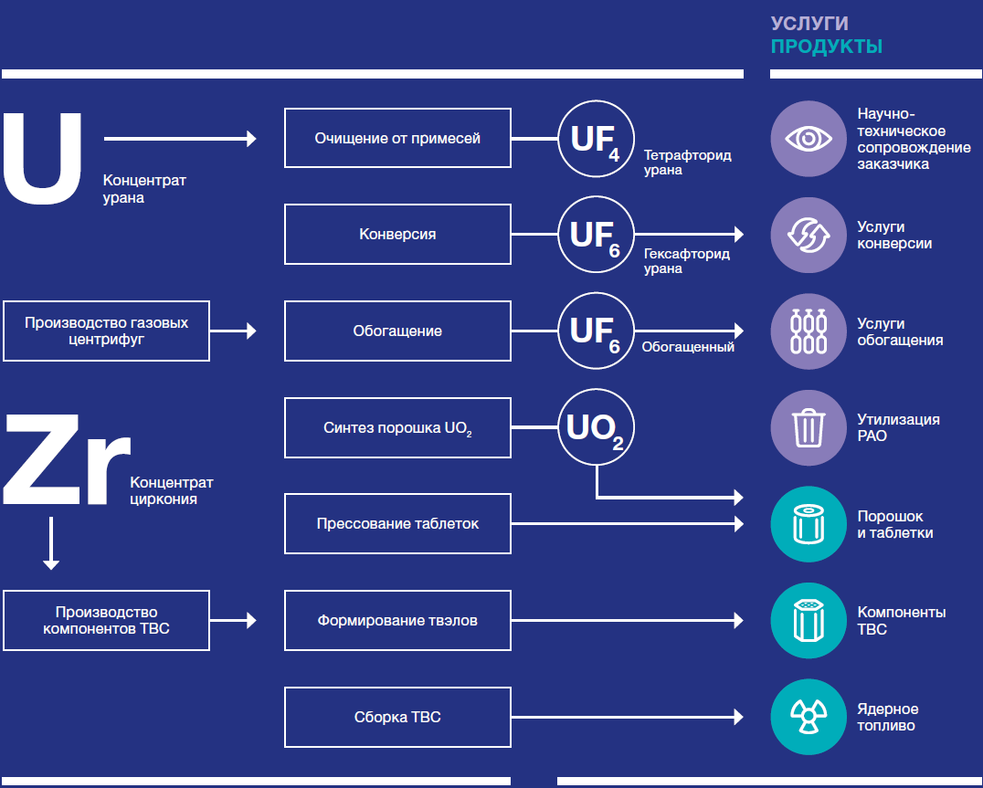 - Высокотехнологичная производственная база, материалы (в т. ч. регенерированный и отвальный уран)