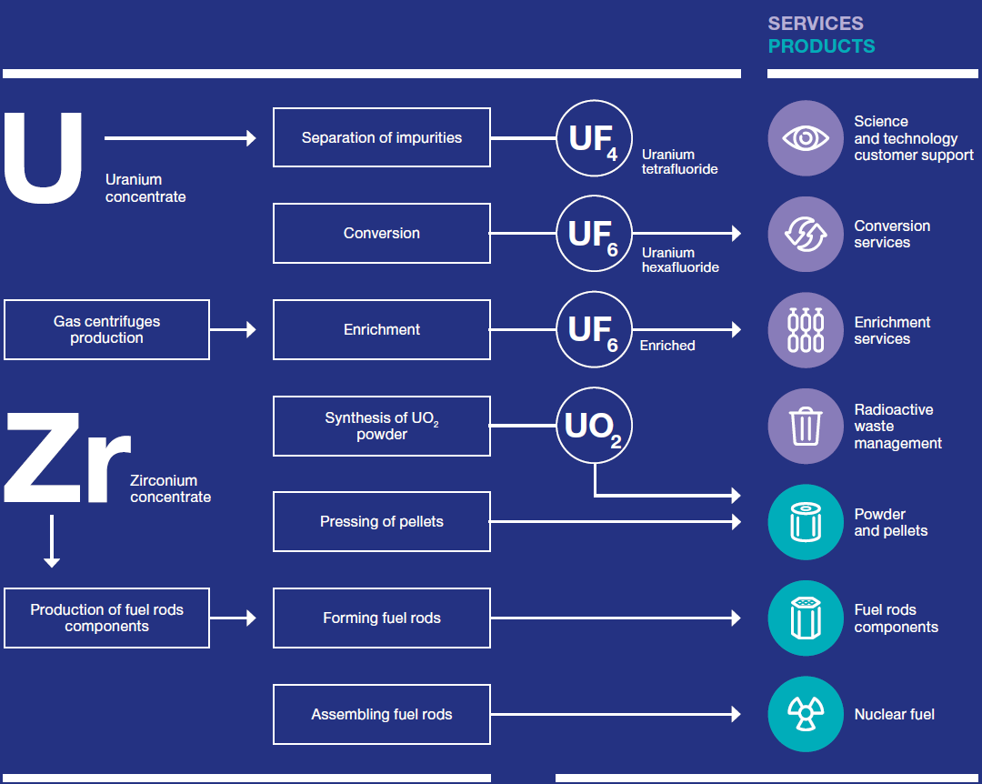 Natural Capital is transformed in the course of productive activities of TVEL Fuel Company. The business model scheme represents detailed nuclear production chain: from uranium concentrate processing to nuclear fuel assemblies and customers servicing. TVEL Fuel Company pays great attention to nuclear-radiation and environmental safety, and makes its contribution to address the issues of "nuclear heritage". The section "Environmental Impact" reveals the results of implementation of the environmental policy of the Company.