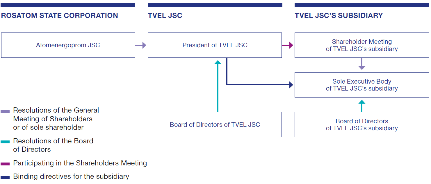 Decisions regarding main production and economic, ecological and social matters are taken by the Sole Shareholder of TVEL JSC – Atomenergoprom JSC. Prior to making relevant decisions the issues must be agreed between TVEL JSC and the profile subdivisions of ROSATOM State Corporation. The decisions are obligatory for TVEL JSC management.