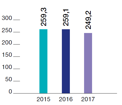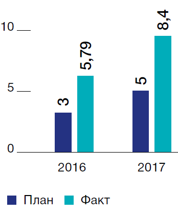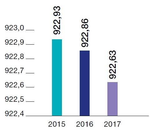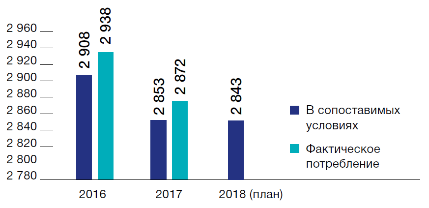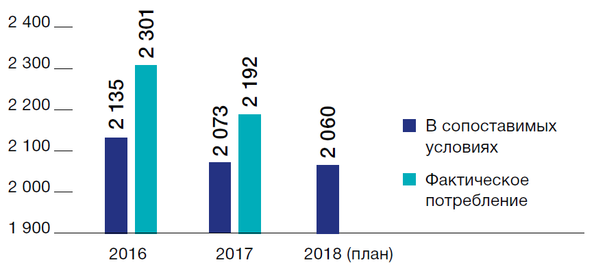 В 2017 году потребление электроэнергии на предприятиях Компании было снижено на 5,67%, тепловой энергии – на 11,5% по отношению к базовому 2015 году в сопоставимых условиях*. Снижение потребления энергоресурсов (в сопоставимых условиях к 2015 году) в стоимостном выражении составило 8,4% (834 млн руб.).
