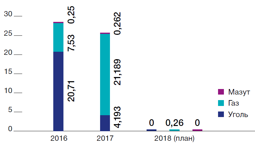 Изменение структуры потребления топлива в 2017 году обусловлено тем, что ТЭЦ АО «СХК» использовала газ взамен угля. Плановые объемы потребления на 2018 год обусловлены тем, что с 01.01.2018 все ТЭЦ преприятий Топливной компании ТВЭЛ выведены за периметр Компании.