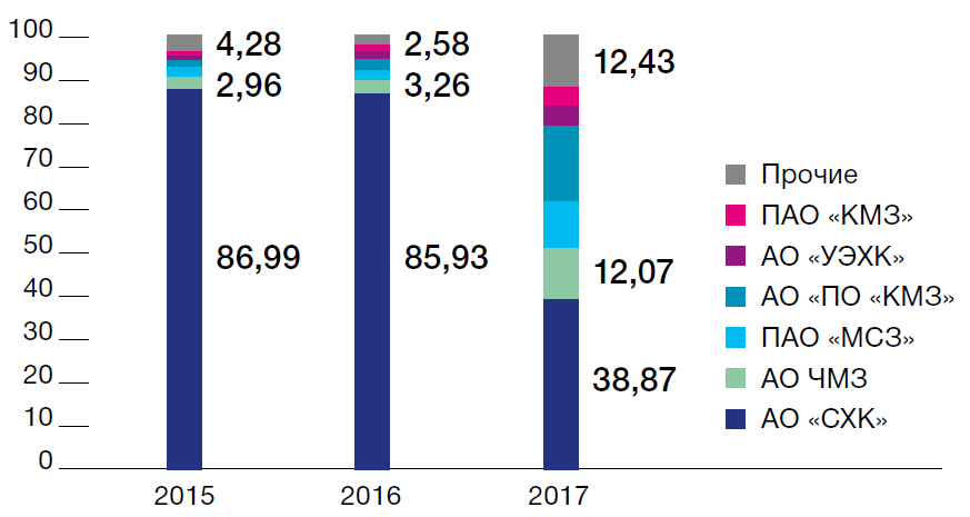 Наиболее крупные объемы выбросов на предприятиях Топливной компании ТВЭЛ осуществляют АО «СХК» и АО ЧМЗ. В АО «СХК» большая часть объемов обусловлена выбросами ТЭЦ Северского филиала АО «ОТЭК» (в период с 1 по 3 квартал 2017 года пользовалось разрешением на выброс АО «СХК»). Необходимо отметить, что данная ТЭЦ снабжает тепловой и электрической энергией населенные пункты, находящиеся в районе расположения предприятия. В АО ЧМЗ выбросы образуются в связи с технологическими процессами химико-металлургического производства.