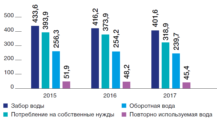 Объем оборотной воды в 2017 году составил 240 млн м3. Доля оборотной воды от общего количества забираемой воды составила 60%, доля повторно использованной воды к общему объему забираемой воды – 11%. Расход воды в системах оборотного водоснабжения сократился на 6%