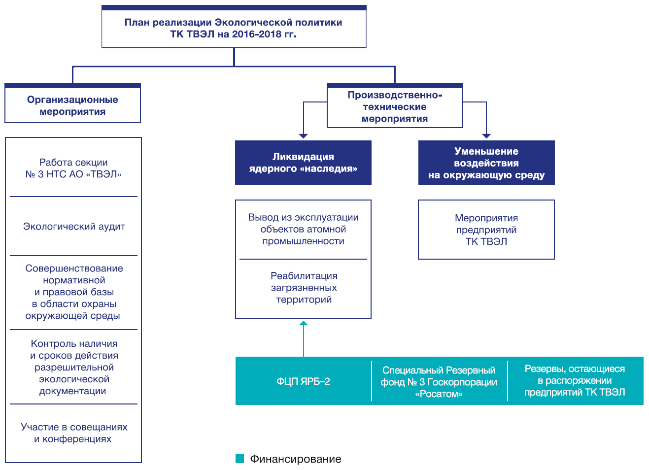 Системное применение руководящих принципов экологической политики, унифицированной методики идентификации экологических аспектов и оценки экологических рисков и возможностей позволяет направлять средства на решение наиболее важных задач, что приводит к улучшению показателей деятельности в области экологии. Приоритетные цели и задачи, направленные на снижение экологических рисков, являются составной частью планирования и включены в программу достижения экологических целей и задач, план реализации экологической политики Топливной компании ТВЭЛ.