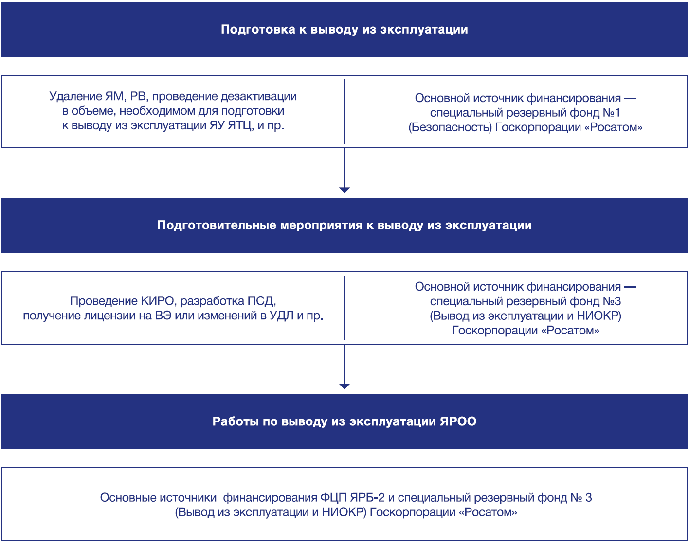 Помимо задач по выводу из эксплуатации ЯРОО и реабилитации загрязненных территорий, вошедших в ФЦП ЯРБ-2, приняты решения о выводе из эксплуатации сублиматного производства АО «АЭХК», производства тетрафторида урана АО ЧМЗ и химико-металлургического завода АО «СХК». Данные мероприятия планируется выполнять частично за счет средств специального резервного фонда № 3 (Вывод из эксплуатации и НИОКР) Госкорпорации «Росатом».