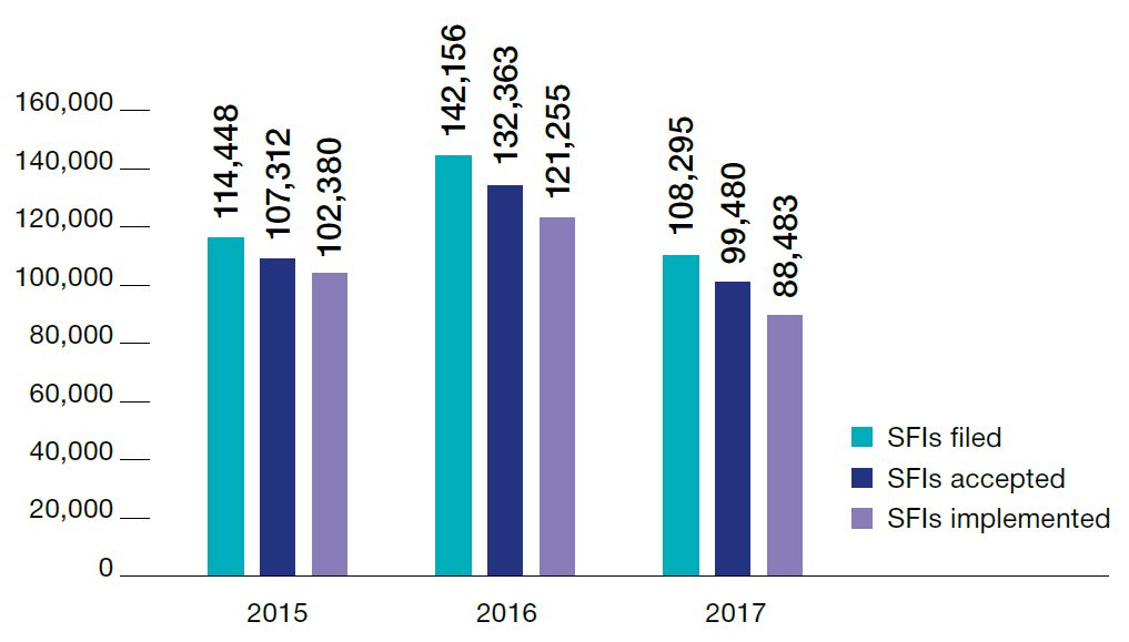 In 2017 there were filed more than 114 thousand SFIs. Efficiency indicator of the SFIs process is the quality indicator; it is calculated as the ratio of the adopted SFIs to the submitted ones. Thus, in 2017,93.8% SFIs were accepted for realization (in 2016 - 93.1%), 95.4% of accepted SFIs were implemented (in 2016 - 91.6%), which is illustrative of SFI quality growth.