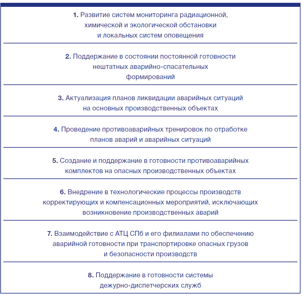 Работа по обеспечению готовности предприятий Компании к аварийному реагированию осуществляется по восьми ключевым направлениям.