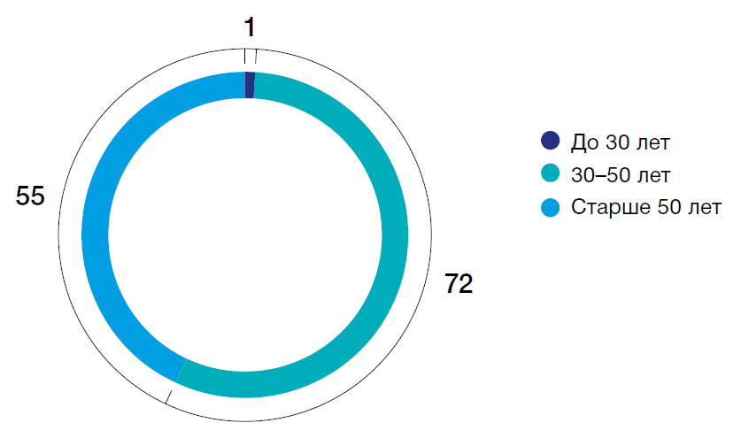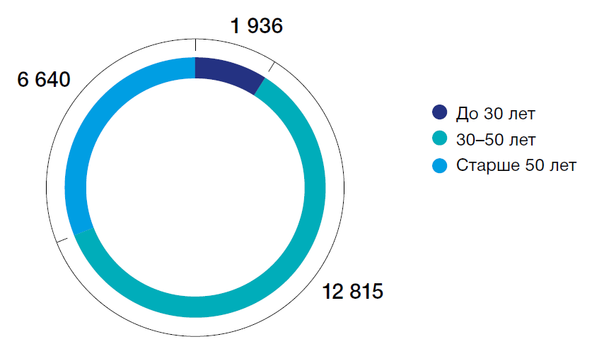 Большую часть среди всех сотрудников составляют мужчины (65,4%)*. Средний возраст персонала Компании составляет 42,6 года. Доля сотрудников до 35 лет включительно – 21,9%.