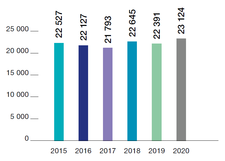 Среднесписочная численность персонала (бессрочные трудовые договора) | 22 250 | 21 780 | 21 383 | 21 954 |