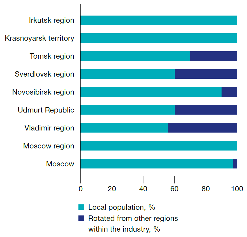 Workforce Category | Moscow | Moscow region | Vladimir region | Udmurt Republic | Novosibirsk region | Sverdlovsk region | Tomsk region | Krasnoyarsk territory | Irkutsk region | Total in 2017 |