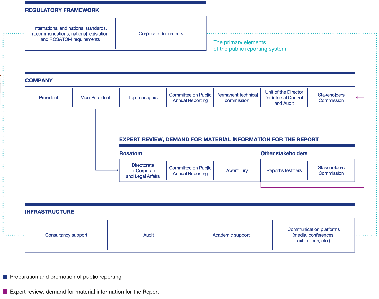 The primary elements of the public reporting system are the following: the operational centre of responsibility, regulatory framework, the representatives of stakeholders (participating in preparation of the reporting data), and infrastructure support (consultative and instructional support, audit, etc.).